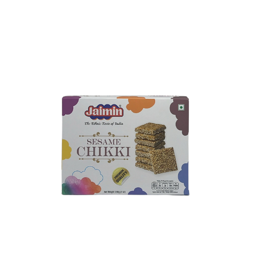 Jaimin Sesame Chikki 200G is a delightful traditional Indian sweet made from roasted sesame seeds and jaggery, offering a crunchy texture and rich, nutty flavor. This classic confectionery is perfect for those who enjoy a sweet treat with a healthy twist. The combination of wholesome sesame seeds and natural jaggery creates a deliciously chewy and slightly sweet chikki that’s both satisfying and nutritious.